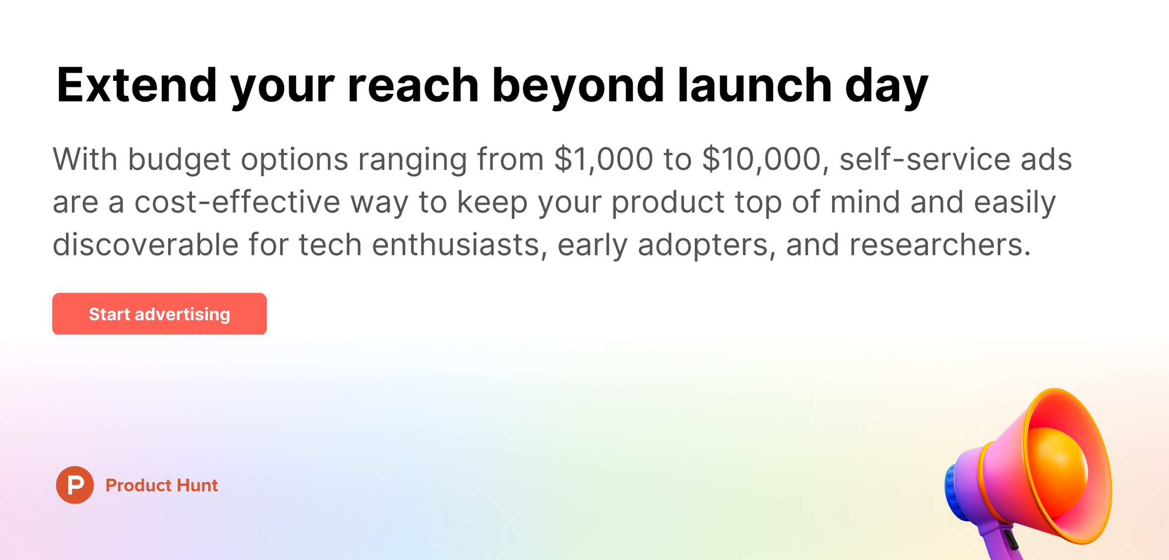 Self-service ads allow makers to target and reach millions of tech enthusiasts, early adopters, product lovers, and researchers who visit Product Hunt daily via search. With budget options ranging from $1,000 to $10,000, self-service ads are a cost-effective way to keep your product top of mind and easily discoverable.