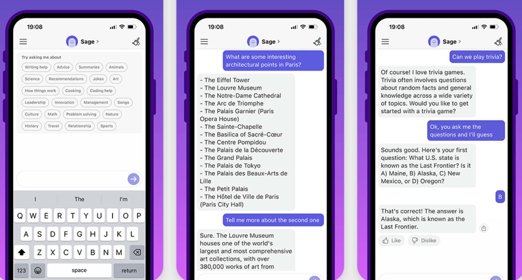 Poe, which comes as an iOS app (soon to be available on other platforms), wants to become a bot aggregator. It currently gives users access to three different bots (Sage, Heron, and Dragonfly), two powered by OpenAI's technology and one by Anthropic, the AI start-up Google recently invested $300M in.