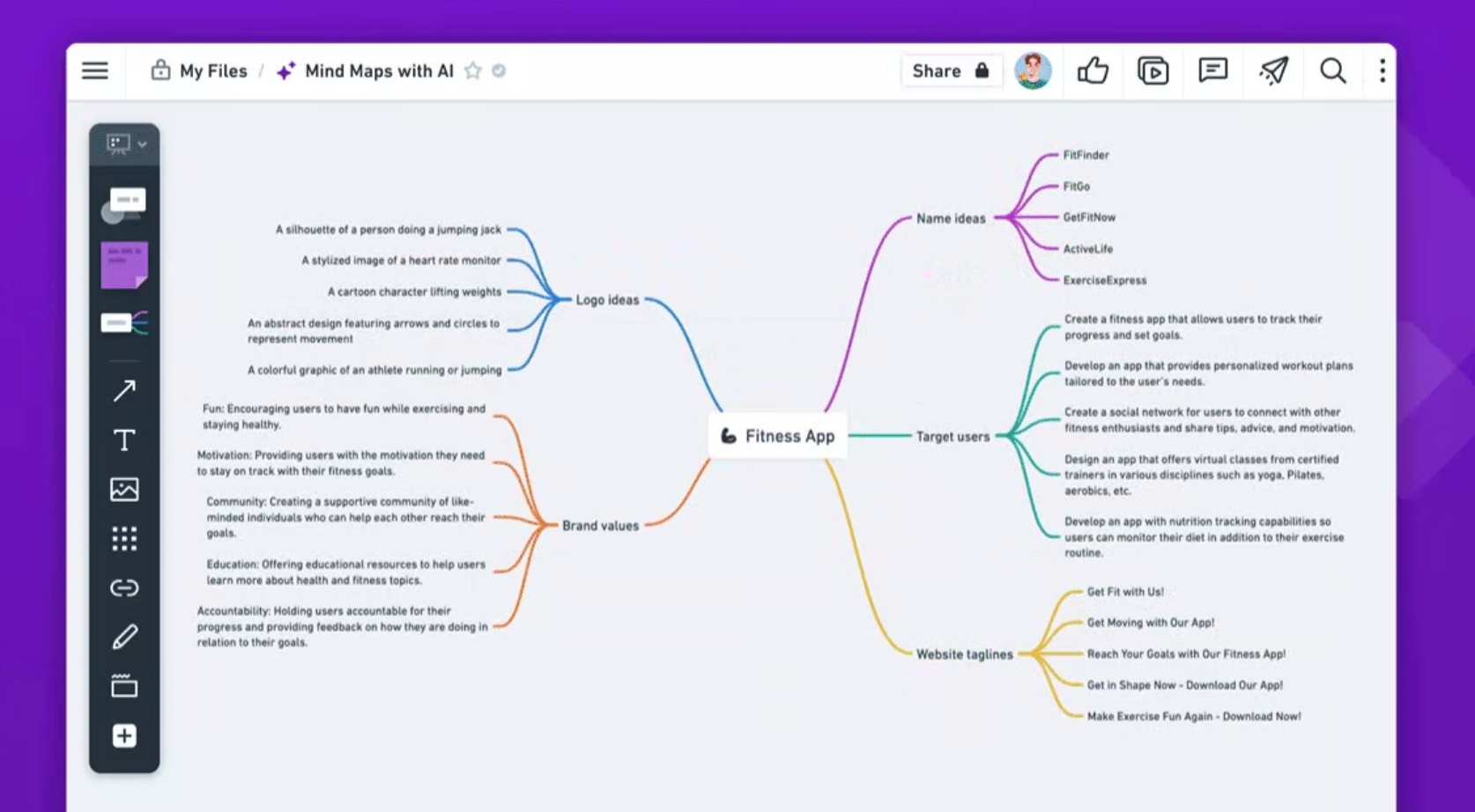 Say you're thinking about building a fitness app. Whimsical AI can help you come up with a name for your product, logo ideas, brand values, and potential buyer personas. Using the provided suggestions, users can generate ideas and conduct research without ever leaving the app or losing their train of thought.