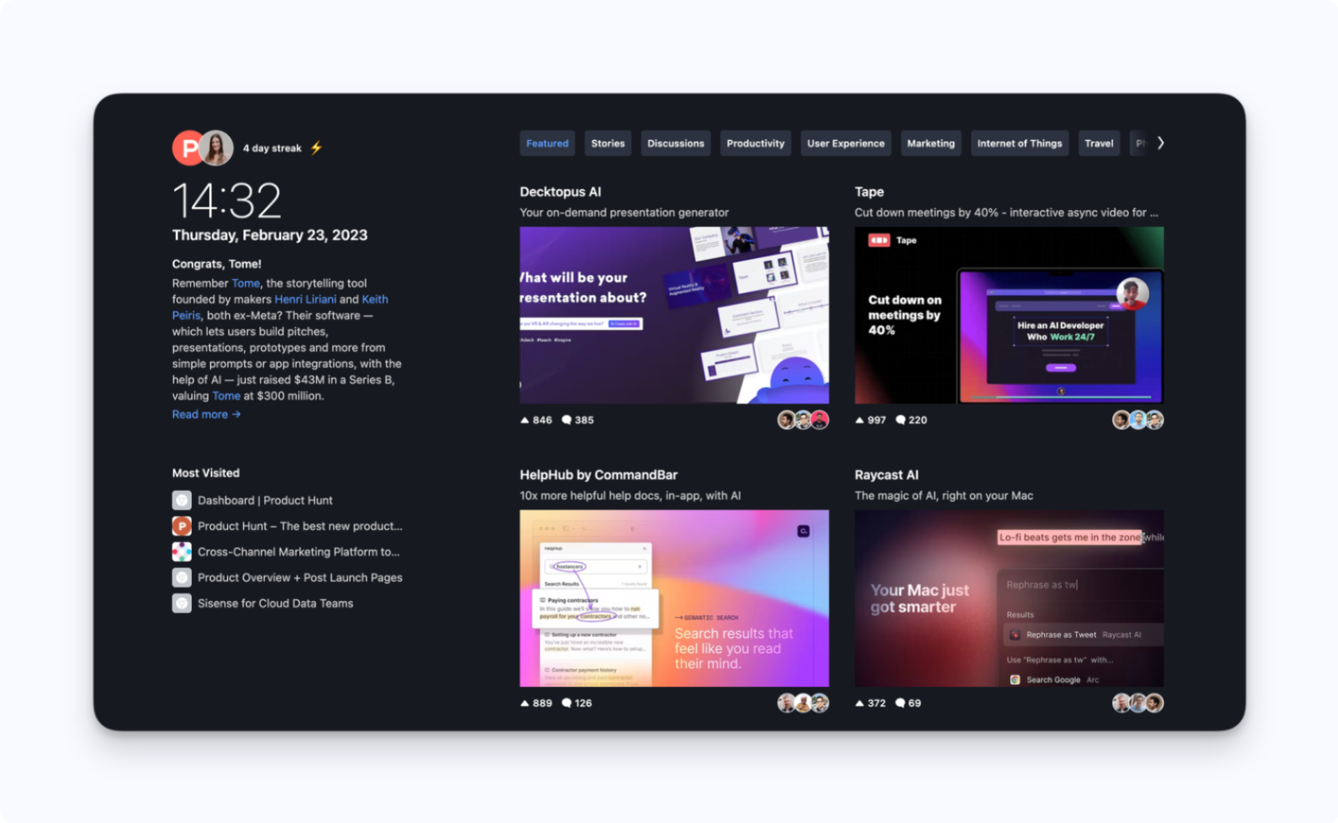 Browse all day while keeping tabs on the Product Hunt leaderboard and using quick filters to explore product categories, discussions, and stories.