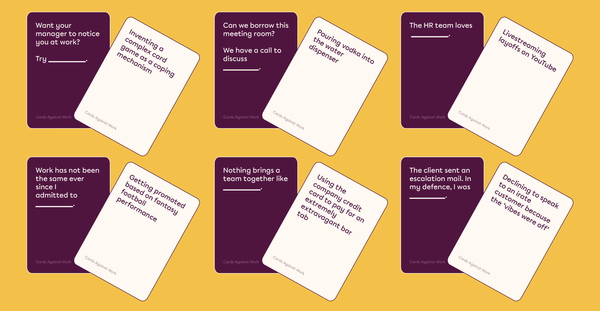 - Cards Against Work is like Cards Against Humanity, but for work.