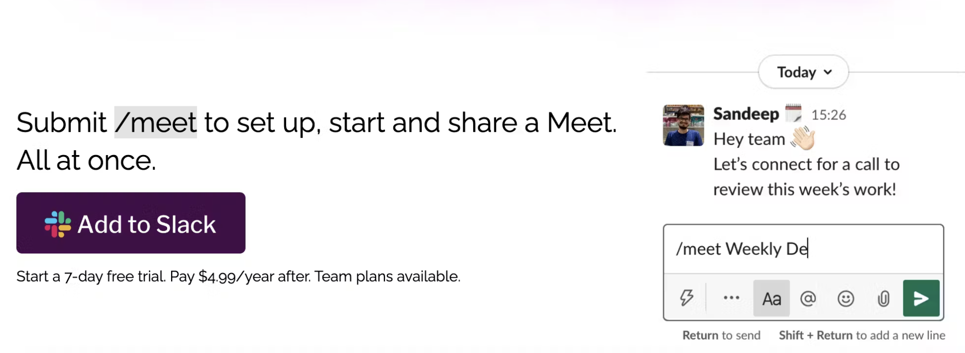 Meet AI for Slack lets you jump on a Google Meet call without leaving Slack.