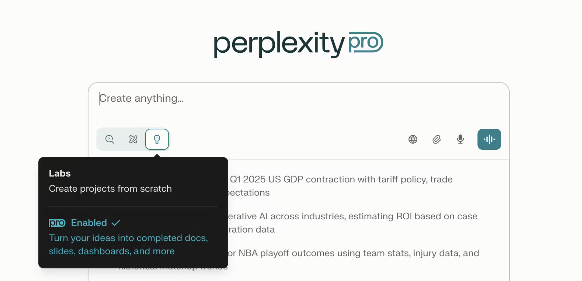 Perplexity Labs is a Pro-only mode that turns your to-dos into done. Drop in your goal, pick Labs, and in about ten minutes you get reports, spreadsheets, charts, or simple web apps complete with code execution, deep web digging, and asset downloads all in one project workspace on web and mobile.
