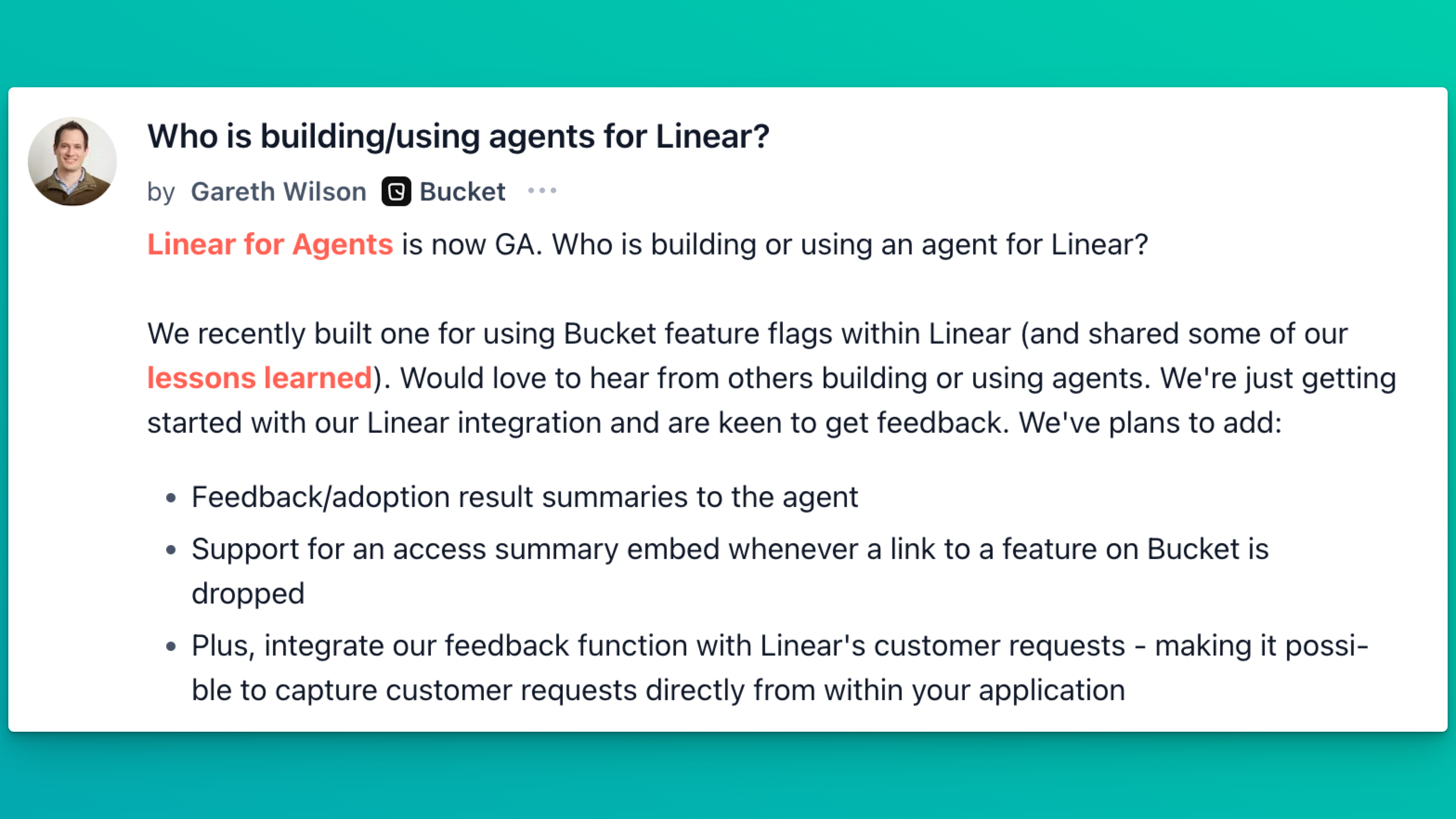 Gareth Wilson dropped into the Linear forum with a simple ask: "Linear for Agents is GA—who's building or using agents for Linear?"